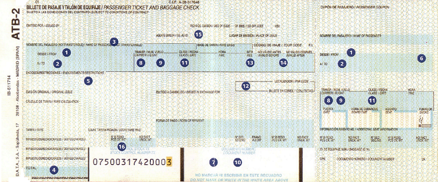 AEROPUERTO DE SALIDA - AEROPUERTO INICIO DE VIAJE AEROPUERTO DE LLEGADA POHIBICIONES DE CAMBIOS Y ENDOSOS EL BILLETE ES NOMINATIVO E INTRANSFERIBLE PRECIO TOTAL DEL BILLETE NOMBRE Y CLAVE DE LA AGENCIA QUE EMITE EL BILLETE TRANSPORTISTA CÓDIGO DE VUELO CLASE EN LA QUE REALIZA EL VUELO SITUACIÓN DEL BILLETE FECHAS LÍMITE DE UTILIZACIÓN DEL BILLETE CLAVE DE SU RESERVA AEROPUERTO DE SALIDA AEROPUERTO DE LLEGADA TERMINAL DE SALIDA NÚMERO DE KILOS DE EQUIPAJE CLAVE DE LA COMPAÑÍA AÉREA NÚMERO DE BILLETE CLASE EN LA QUE REALIZA EL VUELO CÓDIGO DE VUELO TRANSPORTISTA