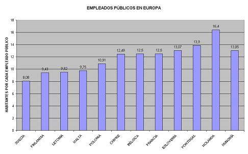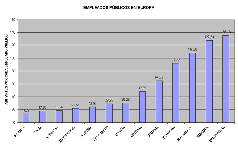 Comenta el siguiente gráfico sobre el número de empleados públicos europeos en 2010. Fuente: EUROSTAT